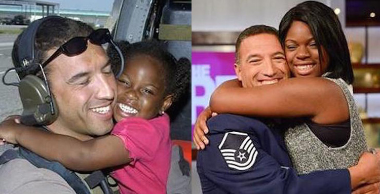 Maroney, an Air Force para-rescue specialist, didn’t even know at the time another Airman had snapped the photo of the little girl, smiling broadly and giving him a giant bear hug. As a father of two, just back from the war in Afghanistan, he said that hug meant a lot to him — and even more as time went by.