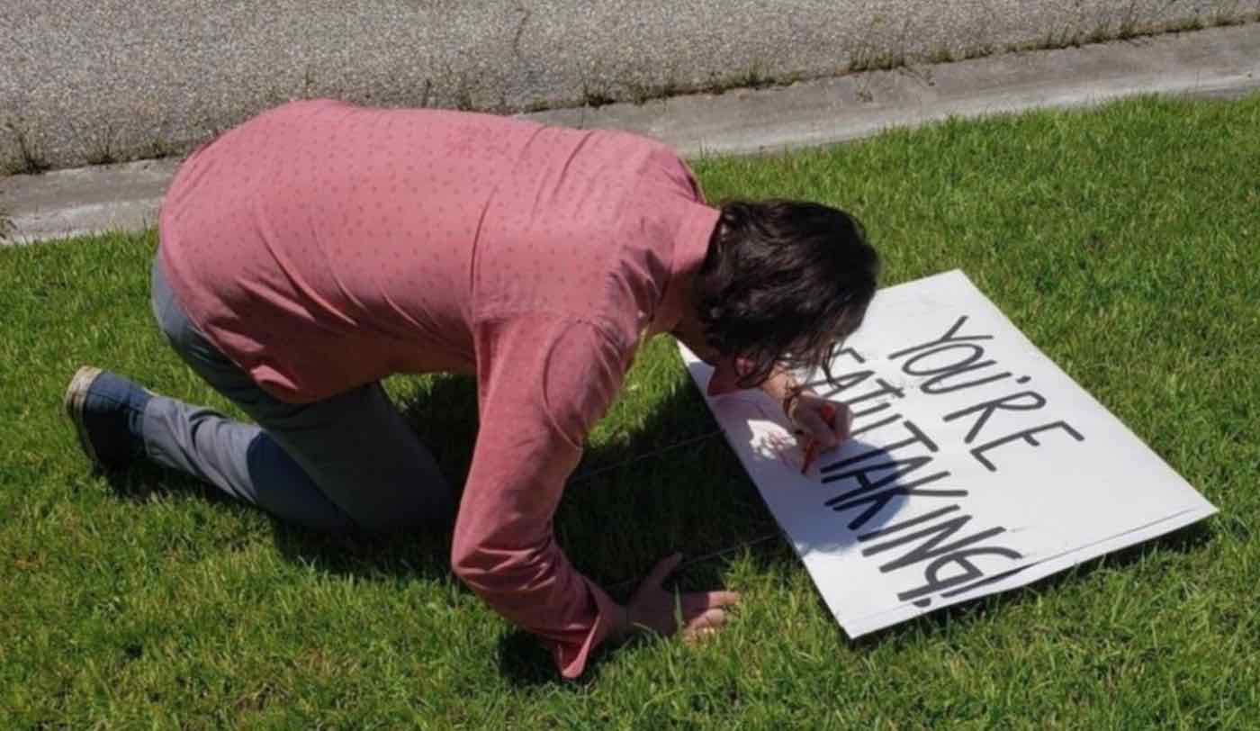 So yesterday this sign was out on a lawn on the way to set. Keanu jumped out of the car and did this. pic.twitter.com/OI1bQJ1nfy