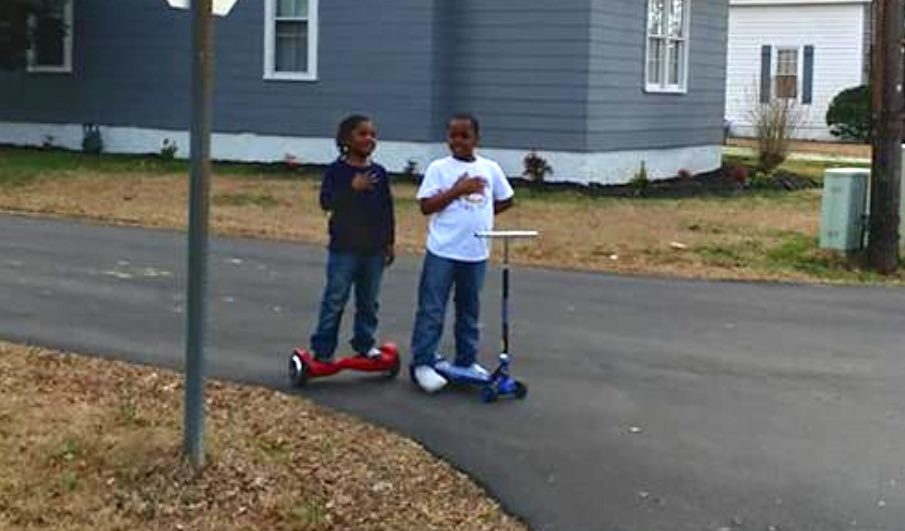 According to the post, the kids had been riding a scooter and a hoverboard down the road when they paused, put their hands to their chests, and made the pledge of allegiance as the U.S flag was being raised to full staff.