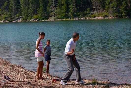 “On a weekend trip to Acadia National Park in Maine, the President showed his daughters, Malia and Sasha, how to skip stones during a hike in the park.” (Official White House Photo by Pete Souza)