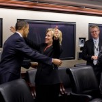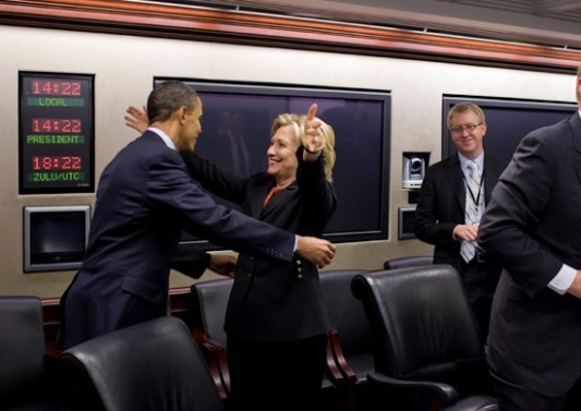 Secretary of State Hillary Rodham Clinton congratulates President Barack Obama on the House vote to pass health care reform, prior to a meeting in the Situation Room of the White House, March 22, 2010. (Official White House Photo by Pete Souza)