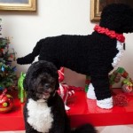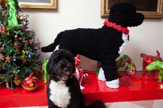 Bo, the Obama family dog, sits by a larger-than-life holiday decoration of himself in the East Garden Room of the White House, Nov. 30, 2010. Some 80 volunteers helped create the 4 foot statue, which is made of 40,000 pipe cleaners. (Pete Souza)