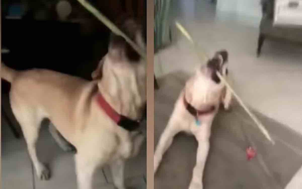 With a little bit of coaxing, she managed to get the 8-year-old Labrador to paw at the wooden rod until it freed the sliding door – and her exuberance over his clever rescue is infectious.