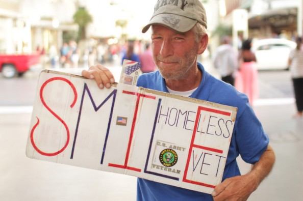 Alan McCracken is a United States Army veteran who proudly served his country for 6 years before being honorably discharged. After his service ended, he fell on hard times and wound up homeless, living on the streets and eventually making his way to Las Vegas. He can often be seen downtown holding a large sign that says “SMILE.”