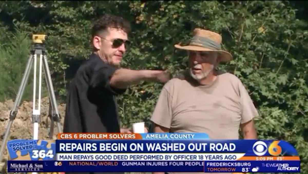 Although dozens of volunteers stepped forward to help fix the road, one man in particular found a greater meaning in his mission: he was helping to repay the police officer who saved his life 18 years ago.