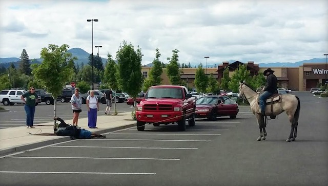 He’s being called the “Lone Ranger” of Oregon after this cowboy was in the right place–a Wal-Mart parking lot–at the right time to rescue a lady in distress, just like a knight on his steed.