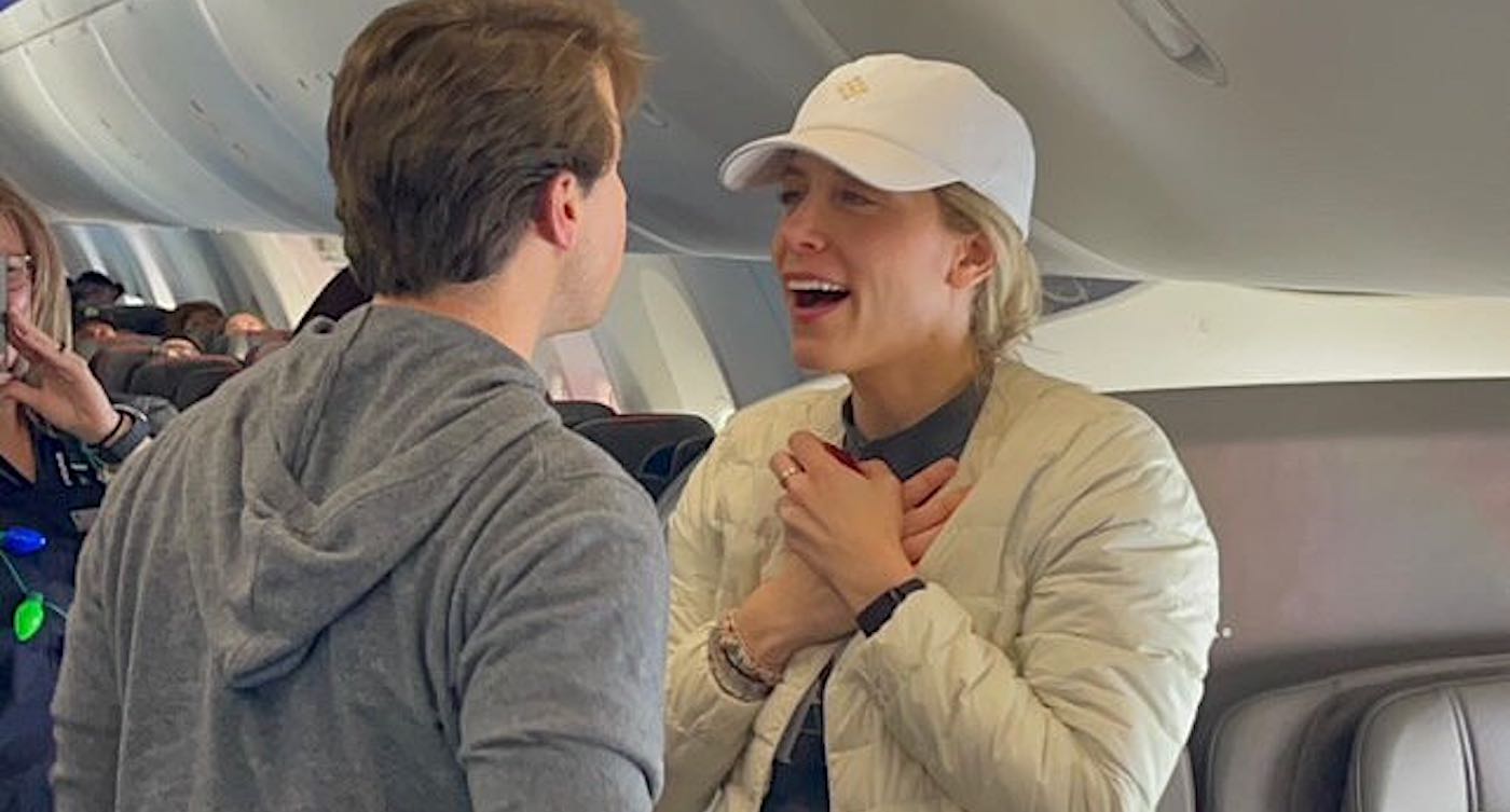 Halfway through their flight from Charlotte, North Carolina, Sam serenaded Lissy with the song from the movie and proposed, getting an almighty ‘Yes!’ in response.