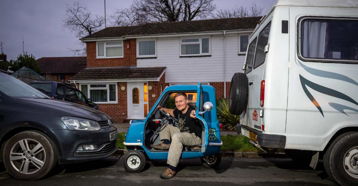 Eccentric Alex, who’s 31 years old, is an avid motoring collector who loves driving around in the tiny three-wheeler.