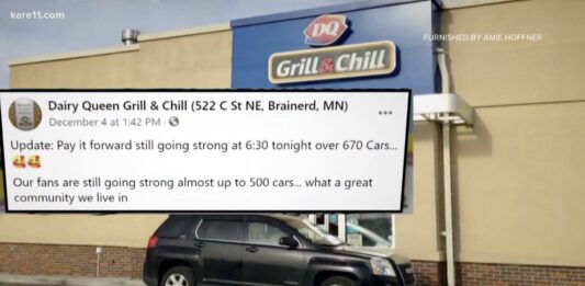 What began as a single act of kindness ignited a chain of good cheer stretching 900 cars long. A Dairy Queen restaurant in Brainerd, Minnesota was the scene of the pay-it-forward chain that lasted nearly three days. The store manager Tina Jensen was excited on December 3 when a man said he’d like to pay … Continue reading Chain Reaction of Kindness Involved Over 900 Vehicles Driving Through a Minnesota Dairy Queen