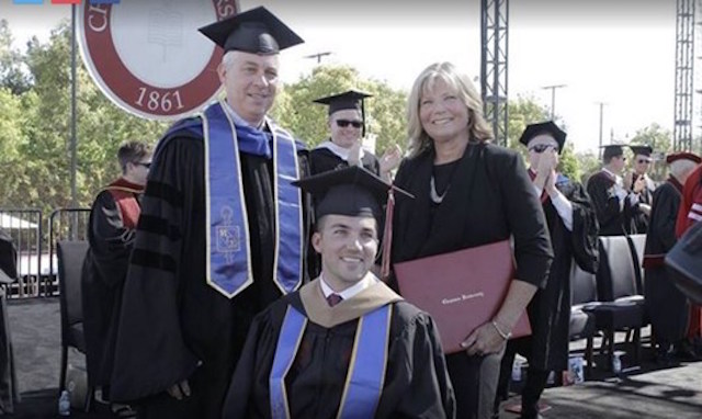 As she wheeled her son across the stage for the graduation ceremony, the announcer pulled Judy up to the podium for the gift. Shocked, the mother tearfully accepted the degree in front of a standing ovation.