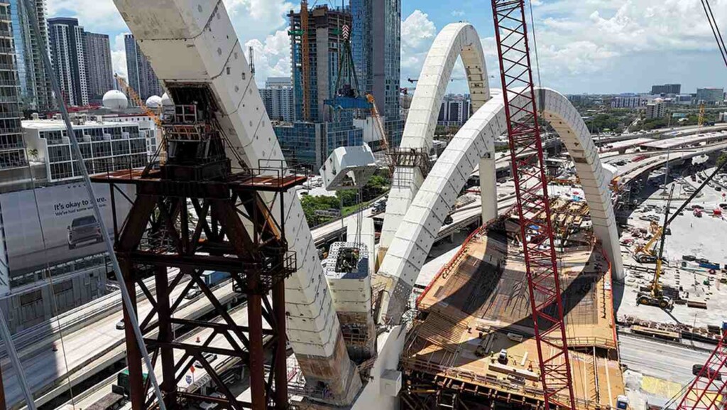 In Miami, the most “complex bridge in the world,” has passed the midway point of completion, with 3 of its 6 magical arches now firmly in place.