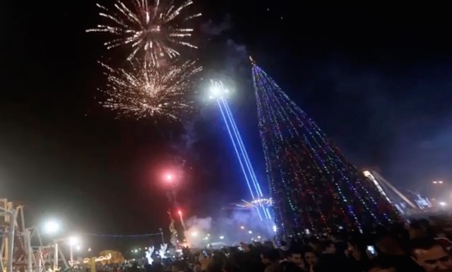 The $24,000 Christmas tree, measuring in at 85-feet-tall and 35 feet in diameter, was placed at the center of the capital’s amusement park.