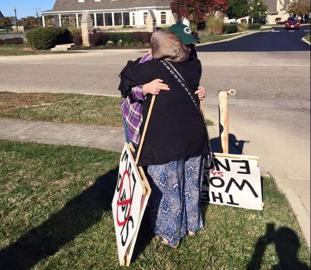 Then an inspiration came to Cynthia DeBoutinkhar, who bravely went up to “Annie” and asked a daring question – could she embrace the protester with a hug? The answer was a reluctant yes.
