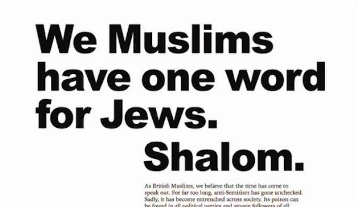 In giant, bold black text across the top, the ad read: “We Muslims have one word for Jews. Shalom.”