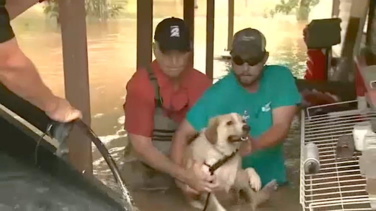 A television crew in Houston, Texas rescued a dog left chained to a front porch last week as floodwaters surged to record levels.