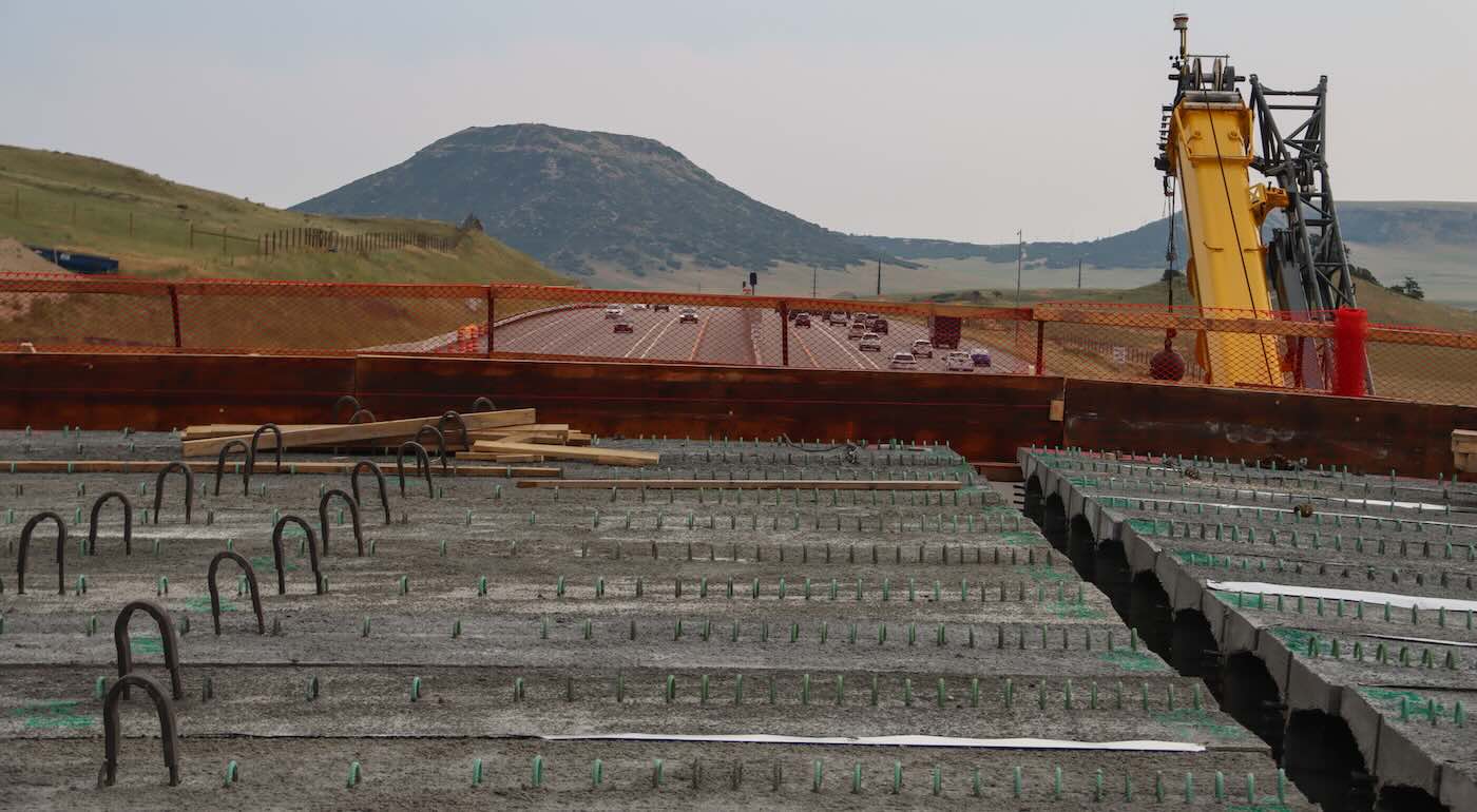 76 girders hold up the bridge deck, allowing big game animals such as moose, bear, mountain lions, elk, mule deer and pronghorn to pass, while 100,000 vehicles travel daily below.