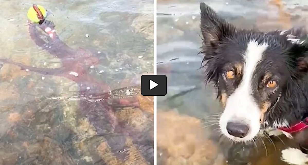 When Lucy’s ball went into the water and she made her way to retrieve it, suddenly the mollusc emerged from under a rock and took control of the floating ball right in front of her.