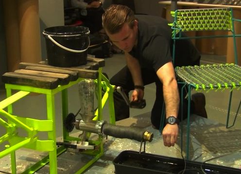 A Puerto Rican design student at London’s Royal College of Art has created a customized bicycle that grinds discarded plastic containers at one end and spits out a colorful plastic ribbon at the other end, useful for weaving into chairs, baskets or pop art. (See photo here)