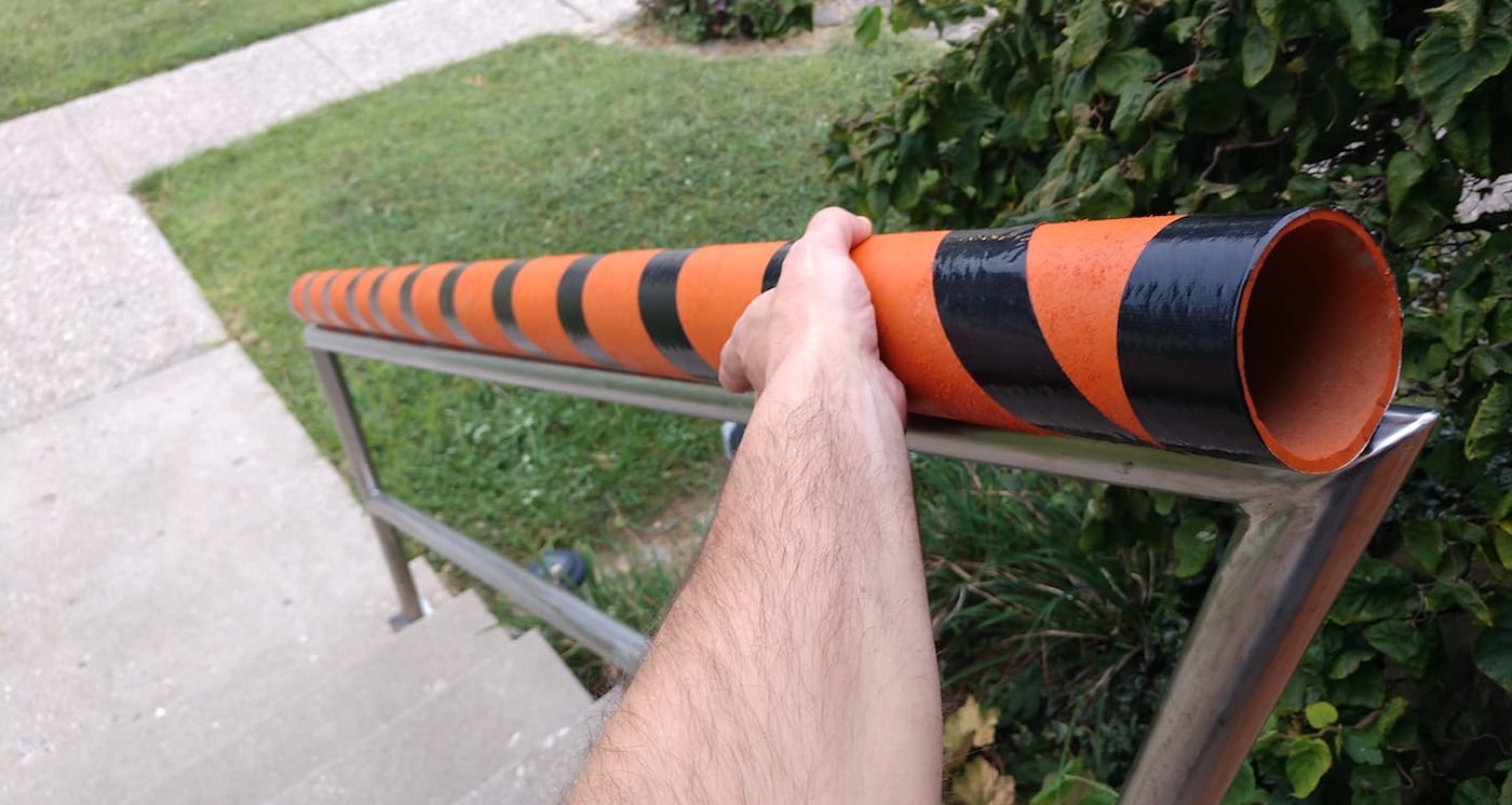 Beattie, along with his 6-year-old daughter, constructed the chute using a six-foot by four-inch shipping tube. After spray-painting their creation orange and finishing up with a spiral of black duct tape, they were ready to attach it to the railing that runs from the family’s porch down to the street. Decorative strings of green and purple lights completed the ghoulish theme.