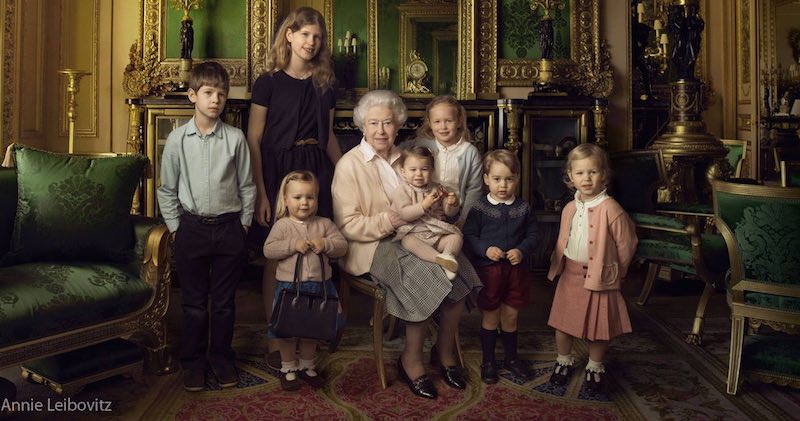 The two oldest children standing to the left of The Queen are her grandchildren, James, Viscount Severn (aged 8) and Lady Louise (12)–the children of her son, Prince Edward. In the front is Princess Anne’s granddaughter, Mia Tindall, (via her daughter Zara Tindall) who is holding the handbag. Prince George (2), in the dark sweater, and in The Queen’s arms –in the tradition of Royal portraiture–the youngest great-grandchild, Princess Charlotte (11 months), are children of Prince William and Kate, now the Duchess of Cambridge. The other two little girls in the picture (one behind the Queen and the other to the far right) are Peter Phillips’s daughters (and Princess Anne’s grandchildren) Savannah & Isla.