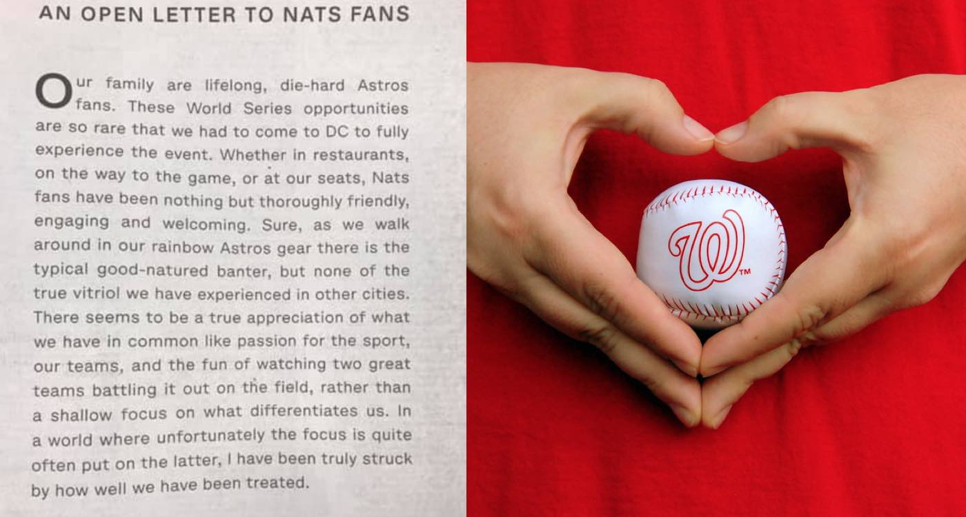 After the Washington Nationals baseball franchise lost three straight games on their home turf last weekend to their opponents, the Houston Astros, there was none of the toxic name-calling that made headlines in the political rags—at least, according to one Texas fan who wanted to thank the city for its cordial hospitality.