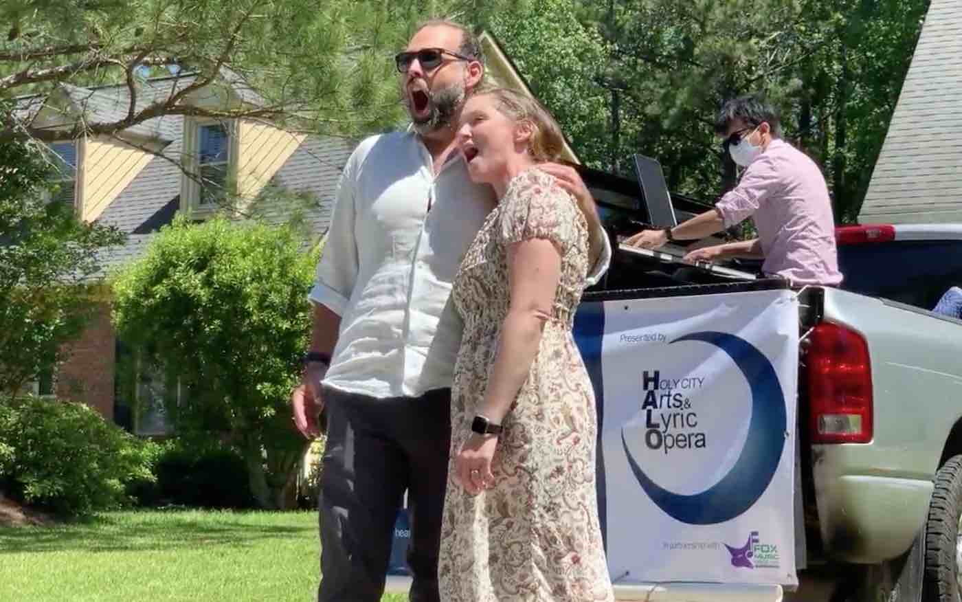 Leah Edwards and her husband Dimitri Pitta are professional opera singers who have been setting up shop at the end of their driveway in Mount Pleasant to perform classical and contemporary opera pieces for their neighbors.