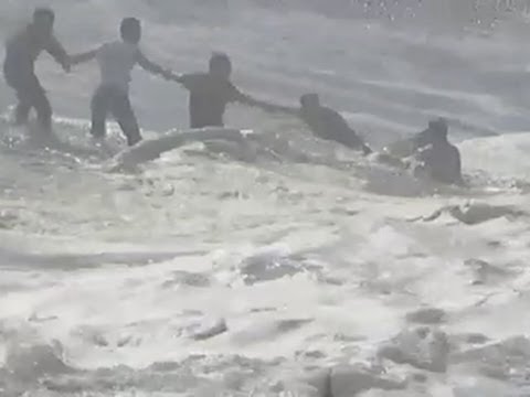 “Beachgoers in Oregon pulled a struggling swimmer to shore by forming a human chain after she and seven others were stranded on a rocky outcropping during high tide.”