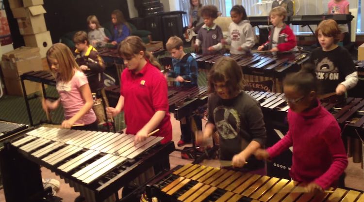 The group is made up of more than 60 kids — age 7-14 — from 48 different schools in the Louisville area. Their percussion version takes the heavy metal hit and transforms it into a multi-textured version using marimbas, bells and drums.