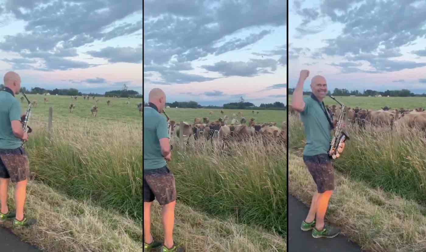 La hija de Herrmann recientemente publicó dos videos de su papá tocando jazz desde McMinnville, Oregon usando su saxofón para dar una serenata a un ganado- y sus videos ya han sido compartidas millones de veces desde que fueron publicados la semana pasada.