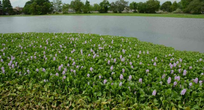 Invasive water hyacinth on a lake in LSU – credit: Louisiana Sea Grant.