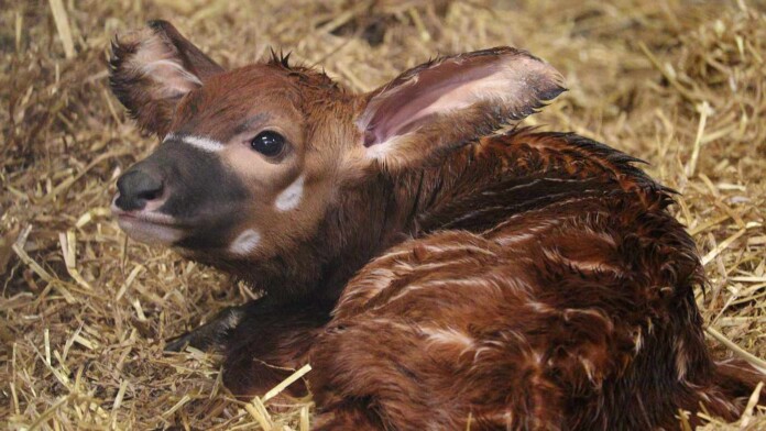 In an English safari park, keepers are celebrating the arrival of a calf from the world’s most endangered species of antelope, the eastern mountain bongo.