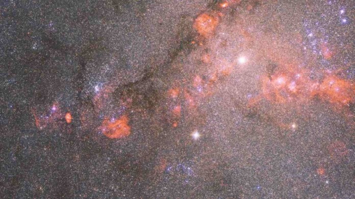 This image captures reddish clouds of ionized hydrogen interspersed with dark lanes of dust. The apparent graininess of the image is actually swarms of countless stars. M33 is one of less than 100 galaxies close enough for telescopes like Hubble to resolve individual stars, as evident here.