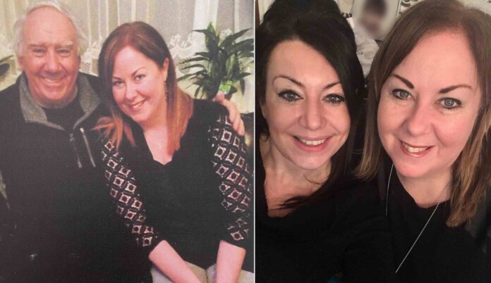 Louise Walters with her father (left) after finding him in 2014, and with her sister Zoe (right) – credit, Louise Walters, via SWNS