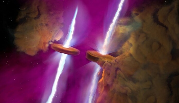 Astronomers were thrilled when they received the news that they were expecting twins—stars that is, after their telescopes recorded dramatic jets erupting from a faraway star system.