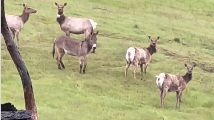 Now five years later, triathlon and hunter Max Fennell posted a video on Instagram of a healthy adult donkey right in the middle of a herd of cow elk.