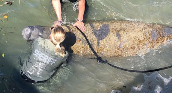 Despite weighing a tiny fraction of the creature’s massive bulk, a determined Pinellas County deputy leaped into shallow water to save a manatee struggling to breathe.