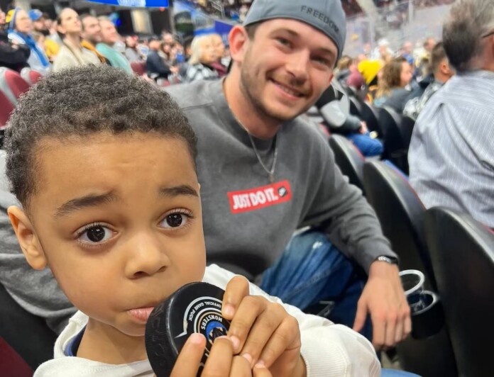 Asia Davis’s 4-year-old son, Nasir, holds the hockey puck that Andrew Podolak saved him from. (Asia Davis)