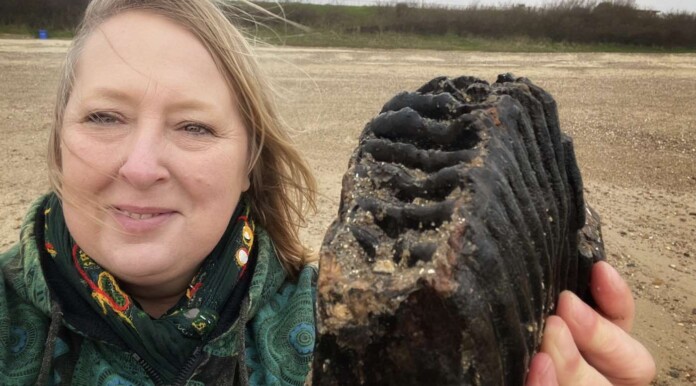 [SWNS] – An amateur fossil hunter is celebrating a once-in-a-lifetime discovery after finding a huge mammoth tooth on a beach.
