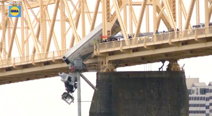Dramatic footage from downtown Louisville, Kentucky, last week showed a semi-tractor trailer truck dangling over the water, after nearly plummeting off the Clark Memorial Bridge.