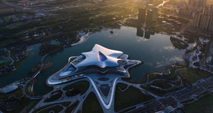 A spectacular seven-pointed spaceship seems to be touching down on a lake in Chengdu for the 81st World Sci-Fi Convention, but in reality, it’s a new museum designed especially for the event that will go on to host future tech and pop culture events for years.