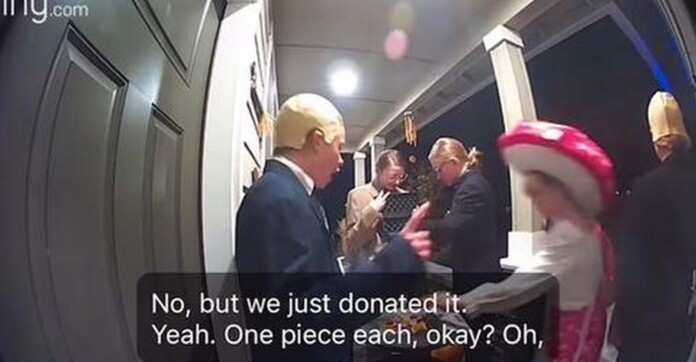 Going viral on social media, the act of holiday generosity was filmed from the house owner’s Ring camera and captured the irony of the three young women, dressed as bald businessmen, donating their own candy and inviting other trick-or-treaters to follow suit.