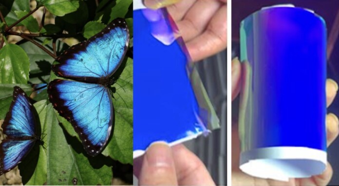 A car with blue paint appears blue because it absorbs light that heats up the car. Morpho butterflies, however, produce their highly saturated blue color based on the nanostructure of their wings. The design of the cooling nanofilm mimics these structures to produce vibrant colors that don’t absorb light like traditional paint.