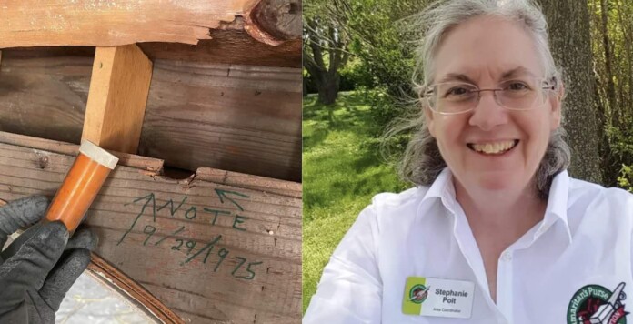 In the town of Green Valley, a carpenter named Dakota Mohn was working in a house damaged by a fire. When he was pulling off the walls in the front living room he saw writing that said, “Note 9/29/1975” with arrows pointing to a small notch in the wood.