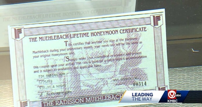 Fast forward to 2023, and the couple is preparing to celebrate 40 years of partnership, and that’s when combing through their wedding album they came across a gift certificate certifying that “anytime you stay at the Radisson Muehlebach during your anniversary month, your room rate will be the same as your original honeymoon rate.”