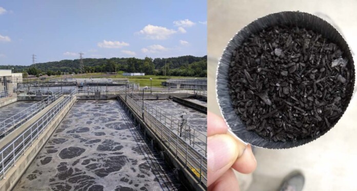 Wastewater plant (left) by Montgomery County Planning Commission, CC license; New biochar from phosphorous (right) by Canadian Light Source