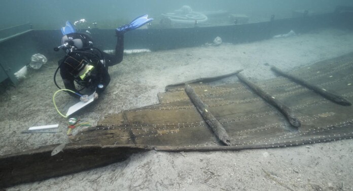 Dinosaur fossils aren’t actually bones; they’re mineralized imprints of bones. In much the same way, wood that remains in water this long becomes more water than wood. The water fills every molecular nook and cranny, and if it were to move the wooden remains would disintegrate.