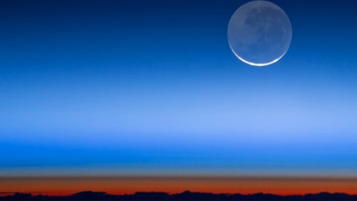 Though the moon is just a crescent, it’s glowing via light reflecting off the face of the Earth, sometimes called “the old moon in the new moon’s arms” which is about 50-times brighter than a full moon.