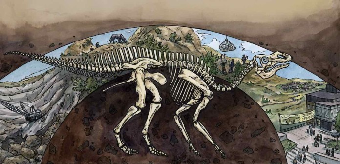 Perhaps it died there, or maybe it was still lumbering about when a flood or landslide struck and sediment buried its body, along with the surrounding cypress and ferns. Heat and pressure compacted the vegetation into coal. But the dinosaur, encased in a sarcophagus of mud and sand, remained intact.