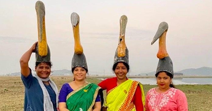 Changing attitudes towards conservation in the Indian state of Assam have these women wearing paper-mache hats to support one of the world’s most endangered storks.