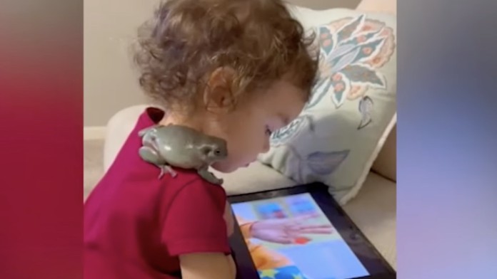 The frog perches happily on Juliana’s shoulder as she watches TV and eats breakfast, and sits in her stroller as she takes him on walks around the house. She’s even taken him in a car to her grandmother’s house to show him off.